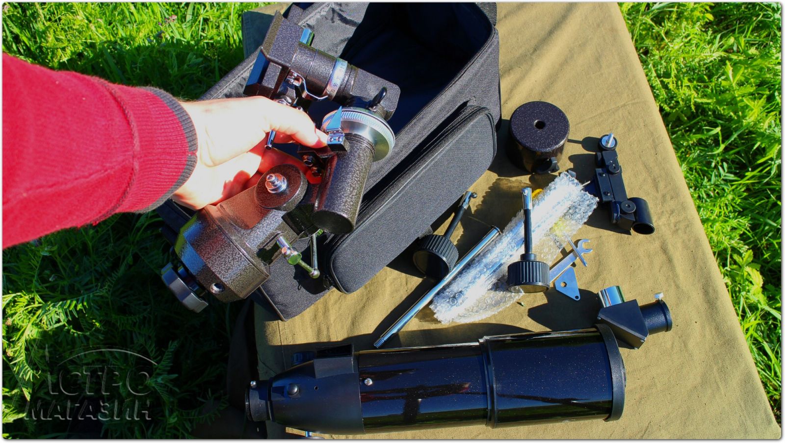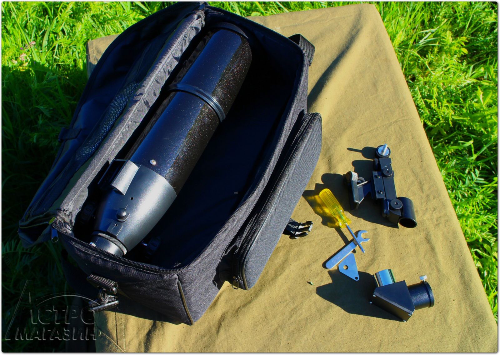 Яркой деталью комплектации телескопа является удобная сумка, в которую телескоп со всеми принадлежностями складывается для транспортировки. Полностью собранная сумка весит всего около 6 кг.