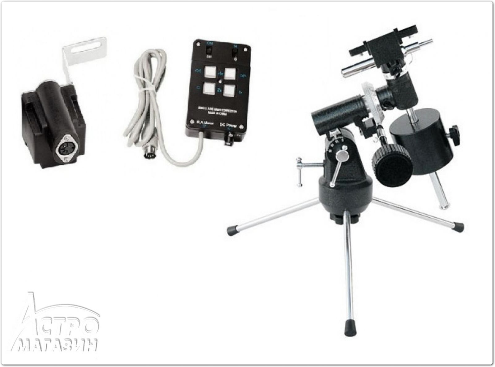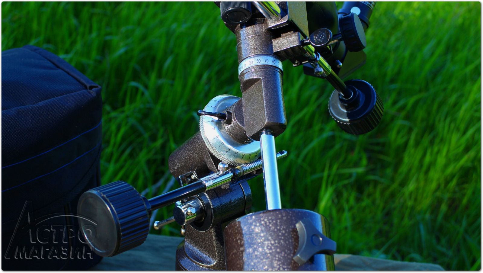 На оси склонений возвратно-толкательный механизм. Ручки микрометрических винтов снабжены тросиками для плавного вращения без лишних вибраций. По обеим осям имеются координатные круги и винты тормоза. Труба прикручивается парой винтов.