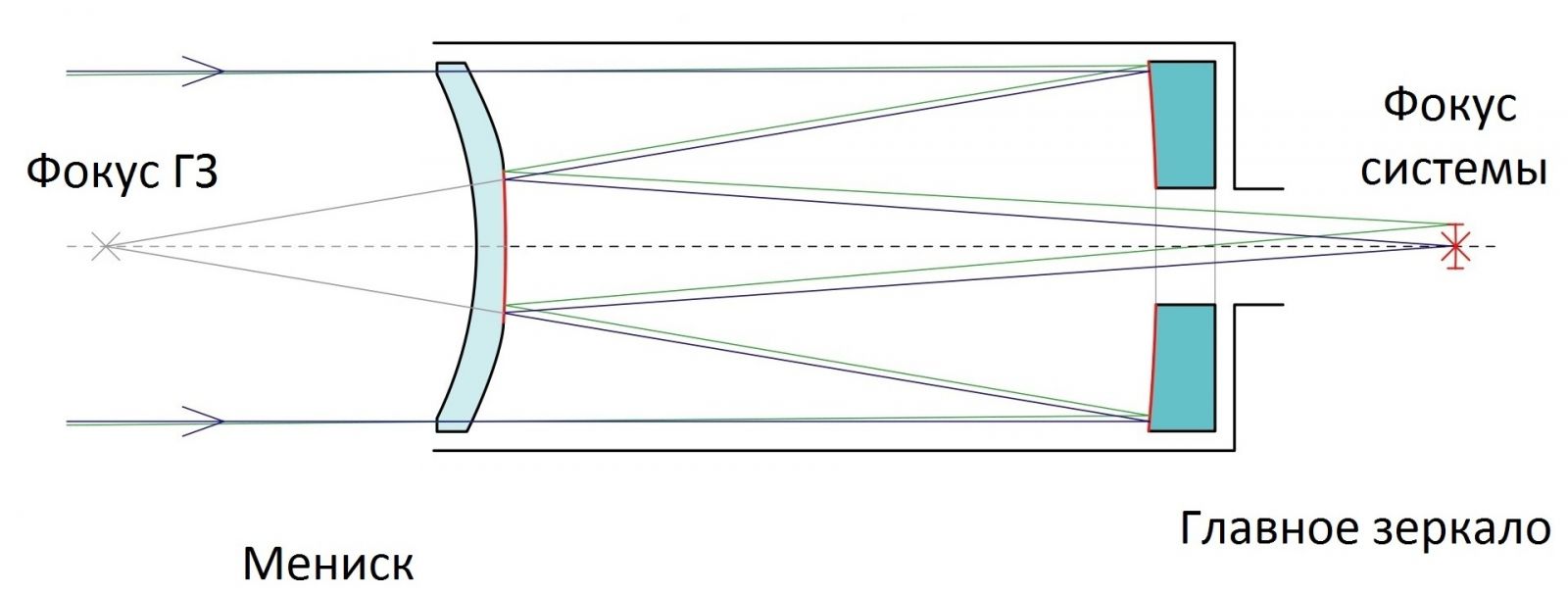 Сердцем нашего МАК-а является главное сферическое зеркало, которое и выступает объективом телескопа. Свет от наблюдаемых объектов проходит через корректор, представляющий собой отрицательную линзу - мениск. После он попадает на главное зеркало и отражается на вторичное, которое напылено на тыльной части корректора. Оно же отражает пучок лучей обратно и через центральное отверстие в главном зеркале свет попадает к окуляру наблюдателя.