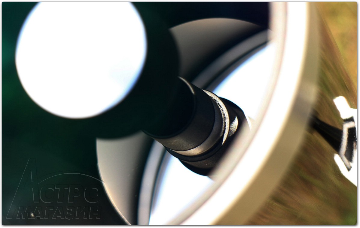 Труба хорошо зачернена, внутри установлена пара бленд-светоотсекателей - так называемая "морковка" на главном зеркале и кольцевая бленда на вторичном. Это полностью исключает попадание паразитных лучей в фокальную плоскость телескопа, а качественное просветление оптики и чернение трубы минимизируют рассеивание света. Это особенно важно при наблюдении ярких планет в местах с большой локальной засветкой, как обычно бывает в городе.