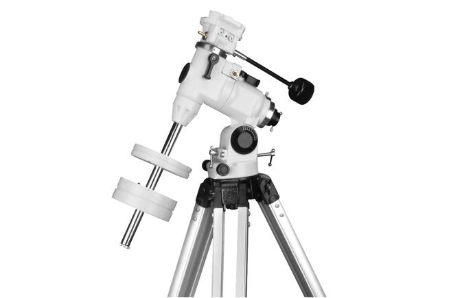 Труба телескопа крепится с помощью стандартного ласточкиного хвоста на экваториальной монтировке EQ3. Монтировка оснащена привычным набором функций - тонкие движения, координатные круги, возможность доукомплектации искателем полюса и полной моторизации монтировки. Головка EQ3 установлена на стандартной для многих комплектаций алюминиевой треноге.