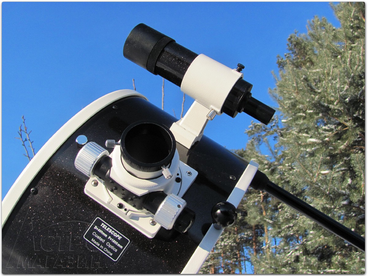 В верхней части трубы заняли своё место стандартный оптический искатель 9х50 и 2'' фокусёр Крэйфорда оснащённый ручкой микрофокусировки с планетарным редуктором 1:10, в работе он очень удобен. Телескоп, конечно, комплектуется парой простых переходников 1,25'' и 2'', а также двумя недорогими окулярами Плёссла 25мм и 10мм.