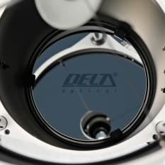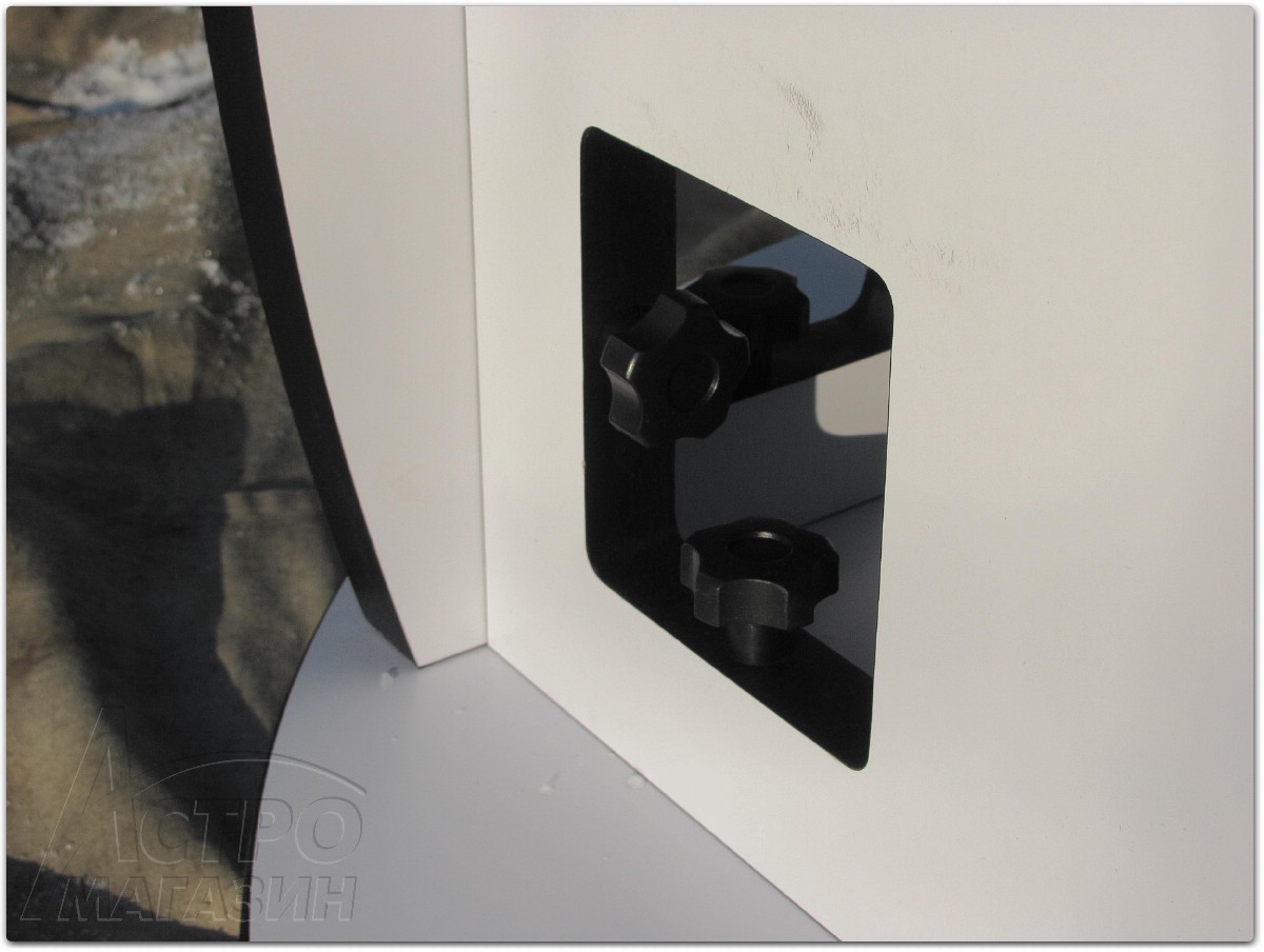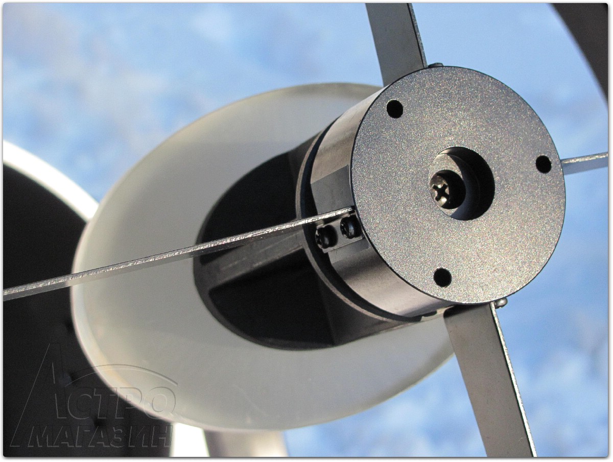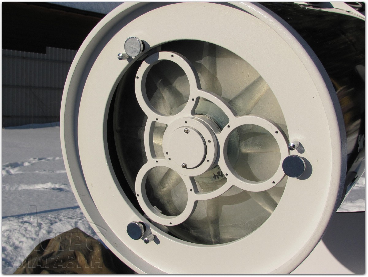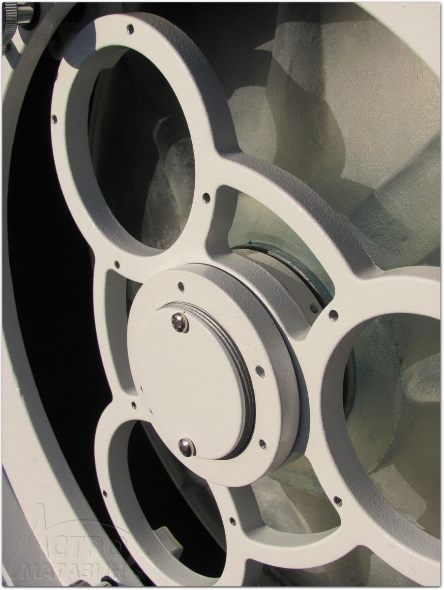 Оправа главного зеркала однозначно внушает доверие. Внешнее кольцо очень толстостенное и в целом имеет вполне привычный вид. Оно оснащено трёмя крупными подпружиненными юстировочными винтами и трёмя стопорными. Подвижная часть оправы отлита из алюминия и имеет очень необычную форму. Она хорошо облегчена, но при этом осталась достаточно жёсткой. Три образующих её кольца имеют отверстия с резьбой для крепления стандартных компьютерных куллеров с целью ускорения термостабилизации главного зеркала. Учитывая его диаметр и массу, эта возможность точно пригодится.