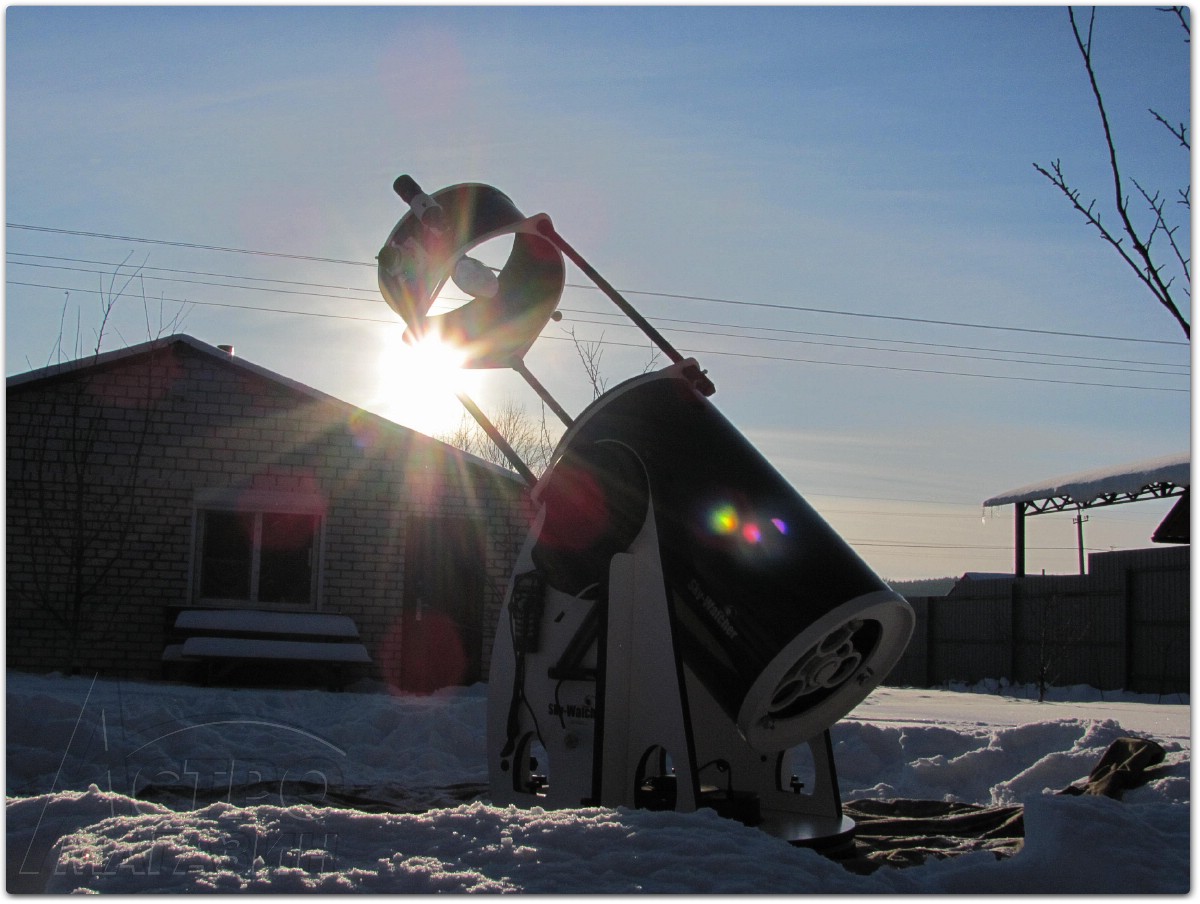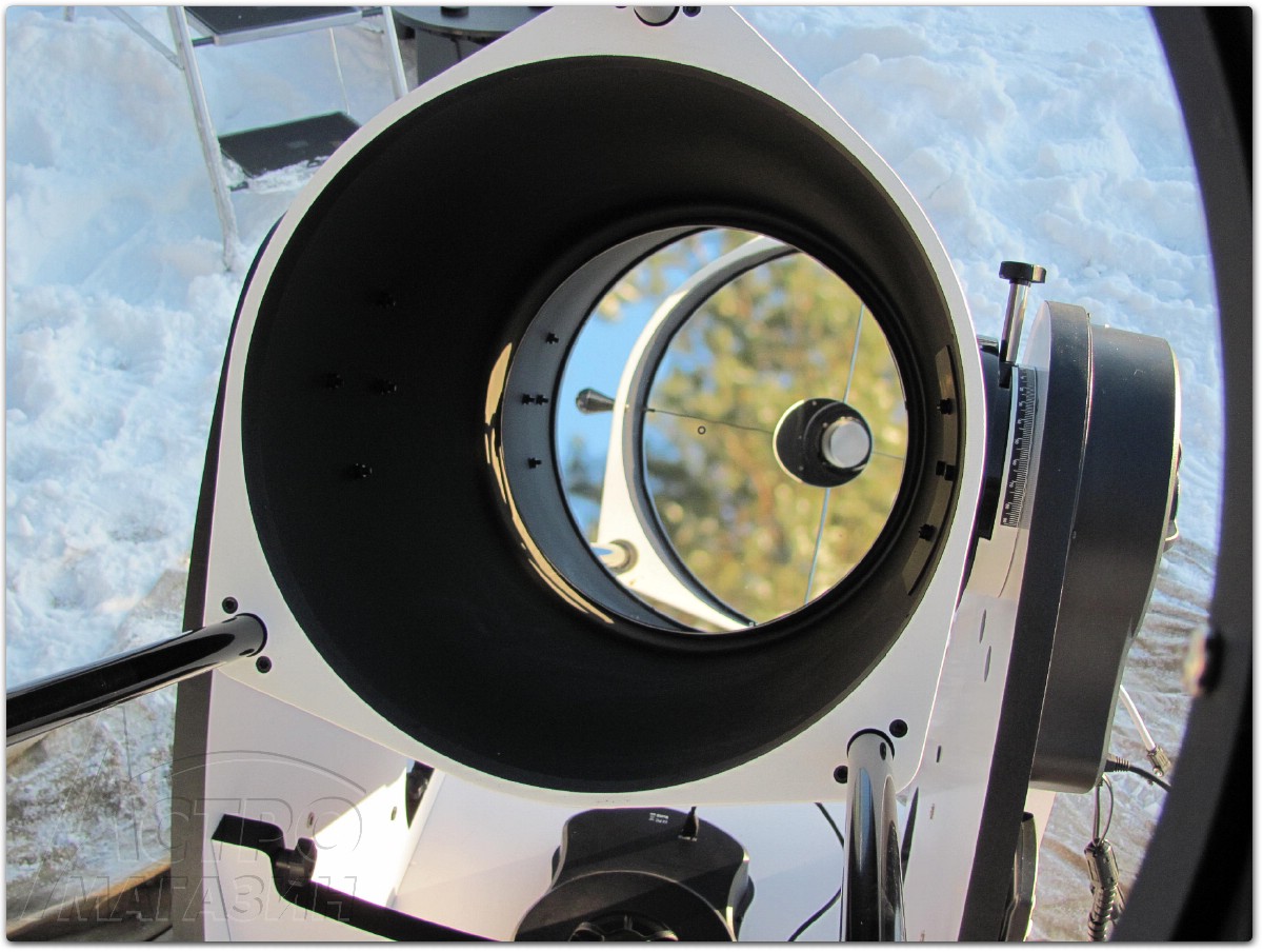 Зимой, когда вокруг снежная целина, любой локальный источник засветки вредит очень сильно, ведь снег рассеивает свет по всей округе. Чтобы избежать влияния боковых лучей на контраст картинки в телескопе мы использовали простое укрытие для открытой части трубы. Оно сделано из обычного туристического коврика вшитого в чехол из чёрной ткани.
