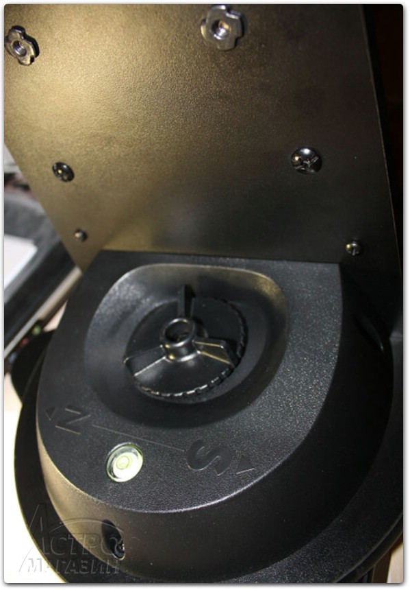 Большую часть коробки занимает собственно сама монтировка. Она достаточно компактна и рассчитана исключительно под настольный вариант. Ее вес составляет 3 килограмма и 900 грамм. Физически она состоит из основания треугольной формы и основного корпуса. Основание устанавливается на плоскую поверхность, а для регулировки горизонтальности основания используются три выкручивающихся ножки. Для того, что бы можно было обеспечить горизонтальность основания, в нем встроен пузырьковый уровень. Точность уровня невелика и ошибка может достигнуть нескольких градусов, но для задач, которые стоят перед этой монтировкой, такой точности вполне достаточно.