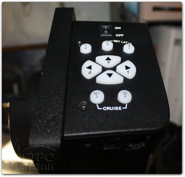 На передней панели в верхней части расположен пульт управления монтировкой. Этот пульт незамысловат. В верхней части мы видим тумблер включения-выключения питания. Есть также блок из четырех кнопок направлений, окруженный пятью цифровыми кнопками. На кнопках нанесены дополнительные обозначения, из которых становится понятно, что они выполняют несколько различных функций. Также отмечены некоторые функции, которые выполняются путем нажатия нескольких кнопок одновременно.