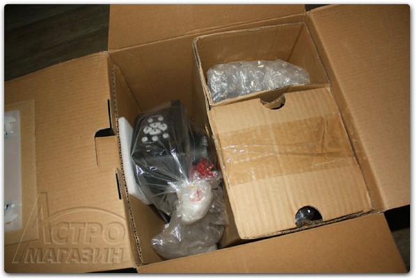 Ну а что же внутри коробки? Раскрывая ее мы видим, что она разделена картонными вкладышами на несколько отделений, в которых находятся упакованные в большие и маленькие полиэтиленовые пакетики детали телескопа и вспомогательные инструменты.