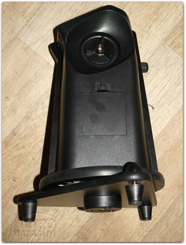 Корпус монтировки пластиковый. Только детали имеющие резьбу сделаны из металла. Таков, например, зажим горизонтальной оси, который хорошо виден в верхней части фотографии. Ослабляя или зажимая его можно отпускать или фиксировать ось, задающую высоту наблюдаемого объекта над горизонтом. В боковой части монтировки видно также разъем отсека батарей, о котором мы поговорим чуть ниже.