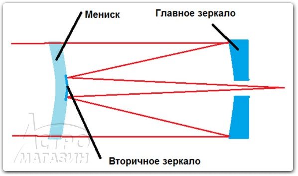 Следует отметить, что Дмитрий Максутов предложил и исследовал большое число оптических схем, но в данном случае имеется ввиду модифицированная Максутовым схема Кассегрена. Классическая оптическая схема Кассегрена состоит из двух зеркал. Главное вогнутое зеркало собирает свет в сходящийся конус, но на пути конуса лучей располагается вторичное выпуклое зеркало и лучи выводятся через отверстие в центре главного зеркала. Основным преимуществом схемы Кассегрена является существенное укорочение трубы по сравнению, например, со схемой Ньютона. Максутов предложил добавить перед главным зеркалом специальный мениск - выпукло-вогнутую линзу, расположенную перед вторичным зеркалом. Правильно рассчитанный мениск позволяет выполнять все поверхности в виде части сферы, что делает производство этого оптсческого элемента достаточно простым. К тому же, внутренний радиус кривизны и радиус кривизны вторичного зеркала выбирают одинаковыми, в результате чего вторичное зеркало получают простым напылением алюминиевого слоя в центральной части мениска. Благодаря компактности получающейся трубы телескопа и сравнительной технологической простоте схема Максутова-Кассегрена (в простонародии МАК) получила достаточно широкую популярность.