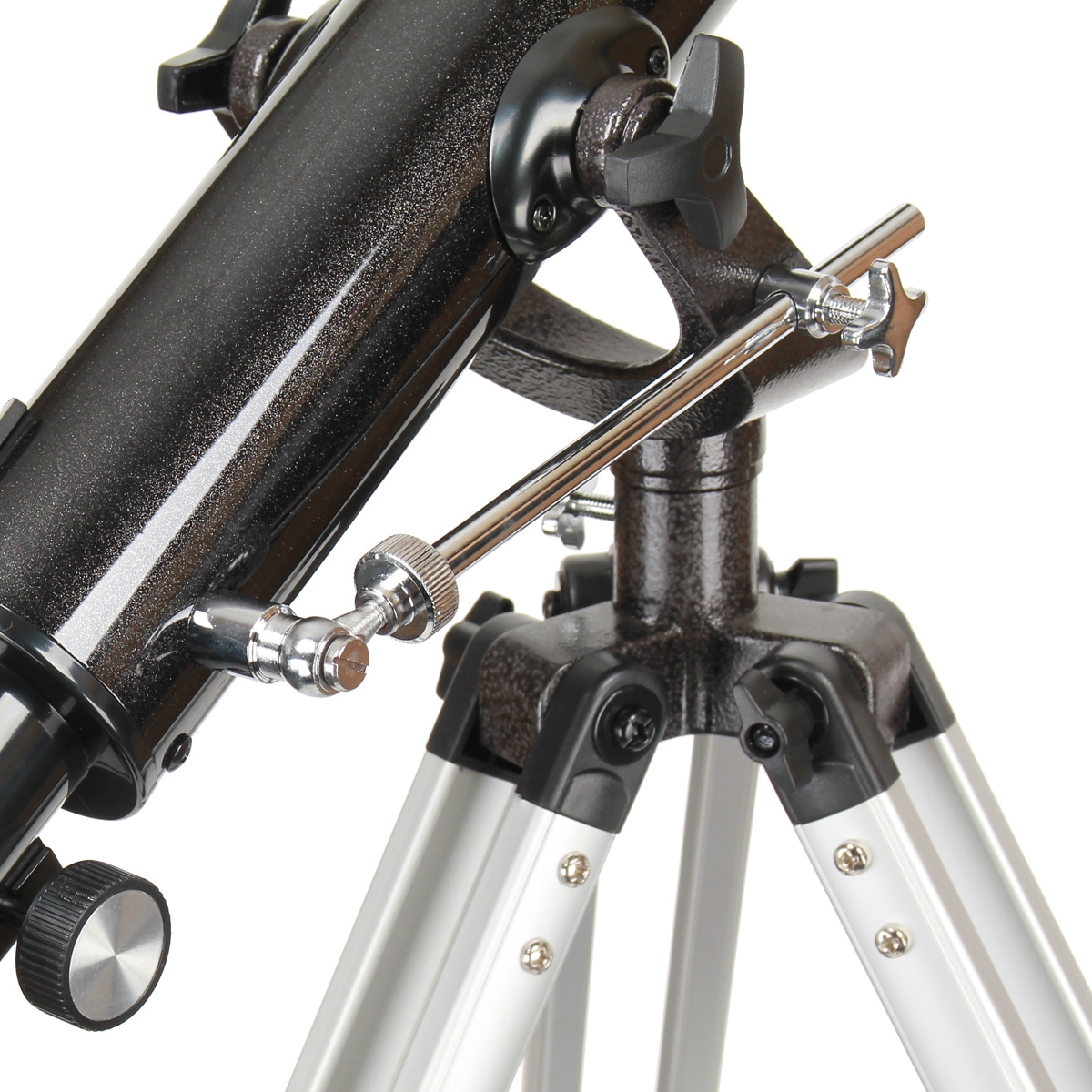 Азимутальная монтировка телескопа AZ-2 имеет вилочный дизайн и снабжена винтом тонких движений по высоте. Вся конструкция представляет собой стержень, который при перемещении трубы двигается по направляющей. Возле соединения стержня с трубой есть рифленый винт с резьбой, вращая который, можно медленно перемещать трубу по высоте. Даже такая простая конструкция обеспечивает более комфортный способ управления телескопом. Перемещения по горизонтали осуществляется без механизма тонких движений, но, тем не менее, очень плавно и аккуратно. Положение трубы по обеим осям можно зафиксировать стопорными винтами.