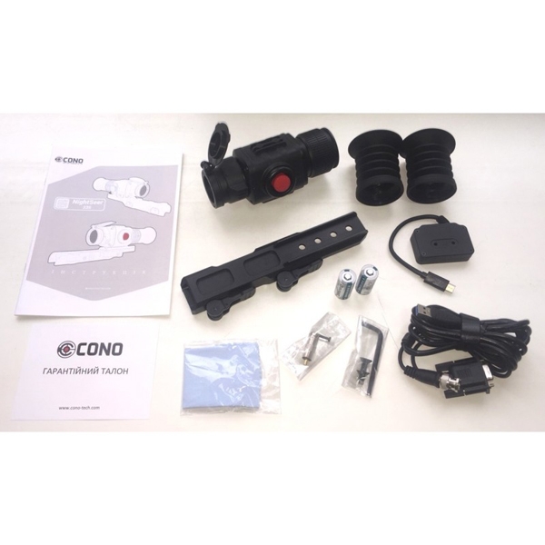 Тепловизорный прицел CONO Night Seer 335 имеет объектив диаметром 35 мм и оптическим увеличением 1,9х. Используемая матрица, имеет размеры 384х288 с частотой 50 Гц. Произведена она во Франции. Прицел очень компактный – размеры  193x65x67 мм при весе 415 г (без кронштейна, аккумуляторов и бленды на окуляр). Вместе с кронштейном вес составляет 800 г. Питание прицела осуществляется от двух батареек или аккумуляторов стандарта CR-123. Заявленное время работы- 5 часов. К оружию прицел прикрепляется с помощью специальной базы под Weaver. База прикручивается к прицелу с помощью двух винтов.