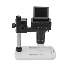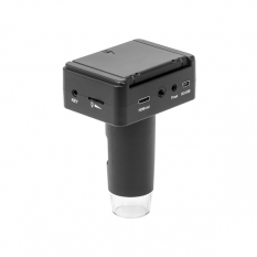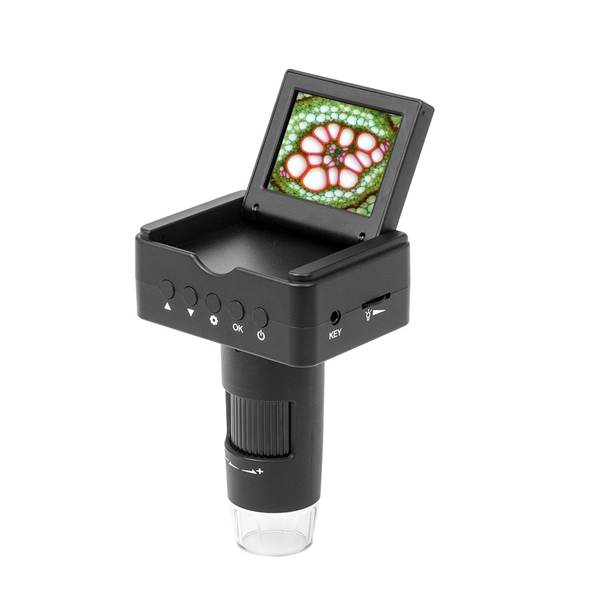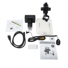 Мощный цифровой микроскоп с цветным LCD-экраном диаго­налью 6 см (2.4"). Может работать от встроенного аккумулятора, допускает подключение к ПК или ТВ-экрану через разъемы USB, HDMI и TV. В комплектацию модели входит микро-SD карта емкостью 4Гб для записи фото и видео в автономном режиме и диск с ПО для обра­ботки фото на компьютере.